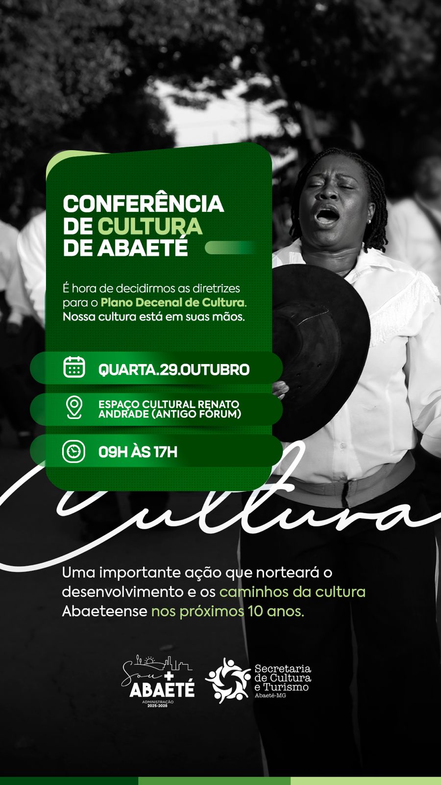 Na última quarta-feira (29), o município de Abaeté escreveu um capítulo importante de sua história cultural ao realizar a 1ª Conferência Municipal de Cultura, evento que reuniu diversos setores da sociedade em um espaço de escuta, criação coletiva e fortalecimento da cidadania cultural. Com o tema central “Cultura que Nos Une, Futuro que Nos Guia”, a conferência consolidou-se como um marco no processo de elaboração do Plano Decenal de Cultura de Abaeté, conectando o município às diretrizes do Sistema Nacional de Cultura (SNC).